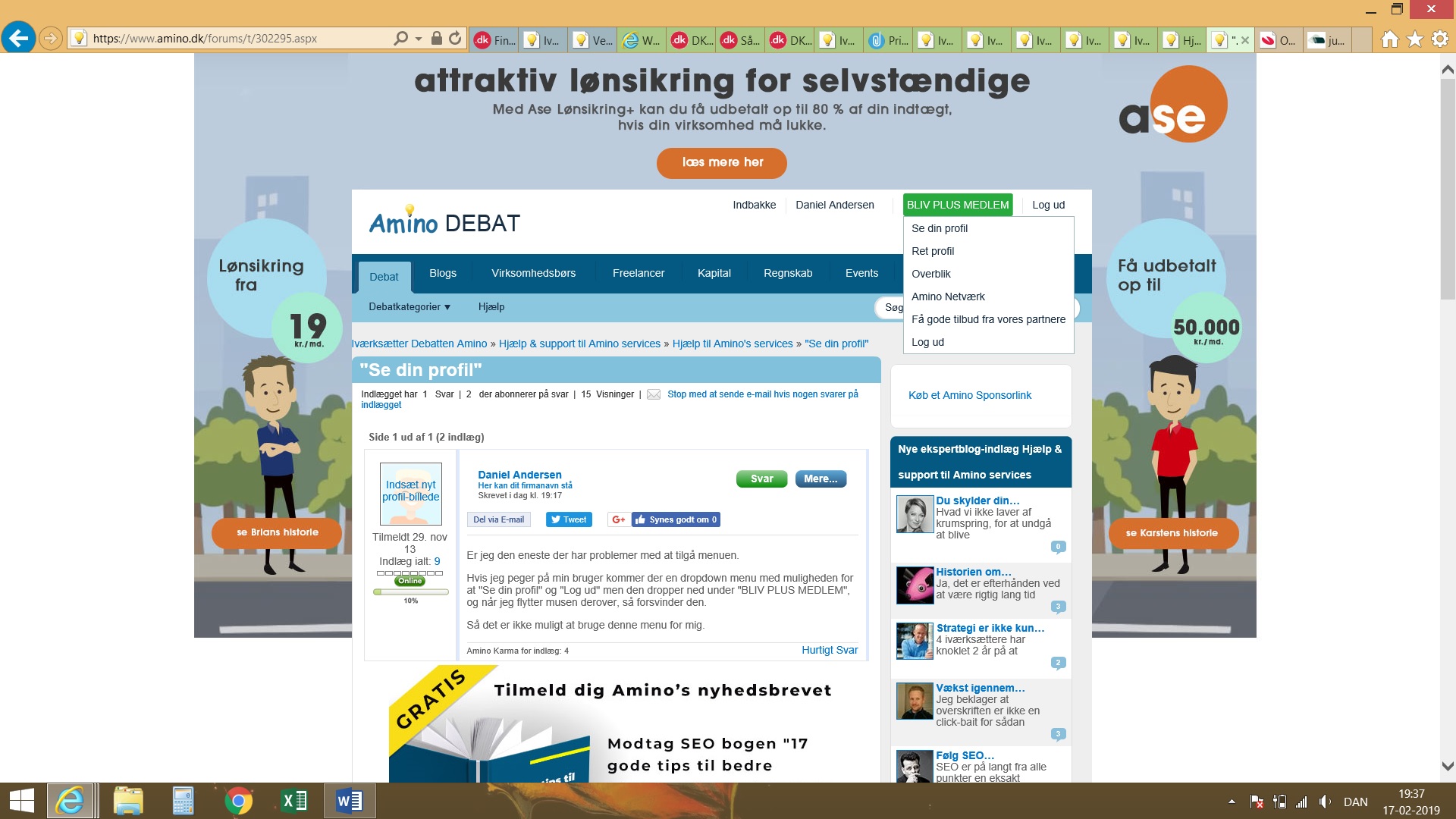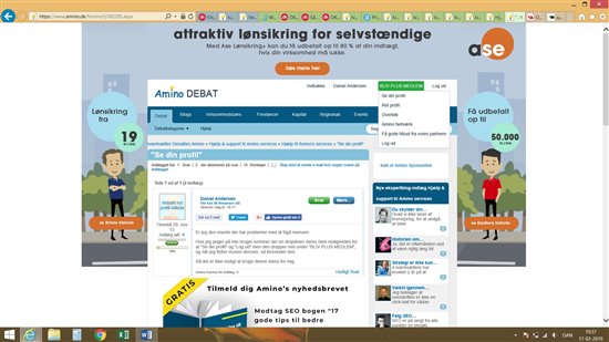 Er jeg den eneste der har problemer med at tilgå menuen. Hvis jeg peger på min bruger kommer der en dropdown menu med muligheden for at "Se din profil" og "Log ud" men den dropper ned under "BLIV PLUS MEDLEM", og når jeg flytter musen derover, så forsvinder den. Så det er ikke muligt at bruge denne menu for mig. |