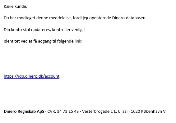 Bare lige til info, så kører der phishing-mails fra en svindler fra Gabon i øjeblikket. De ser sådan her ud: Linket går til en server i Gabon, som fisker ens password. Linker man ender på hedder: https://dinero-dk.ga/ [Klikbart link redigeret af moderator] og det ligner Dinero fuldstændigt.