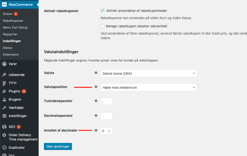 DKK250.00 i ét ord. - desuden er der jo ingen som i Danmark kalder kr. for DKK, men selv KR250,00 i ét ord ser mærkeligt ud. Når jeg prøver at lave et indryk under varens pris i Woocommer pluginet, nægter den, man må ikke lave mellemrum.