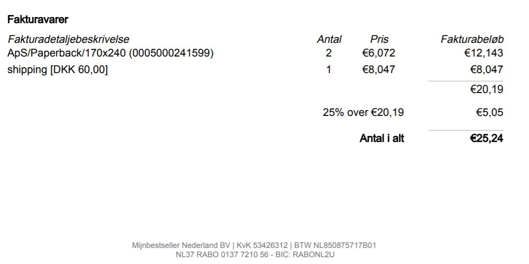 De har da under kontakt en mailadresse du kan prøve; info@mijnbestseller.nl Rent teoretisk (uden at kende din kontrakt med Saxo) så lyder det som en ganske klassisk trekantshandel med 2 danske og en hollandsk virksomhed. Du har en aftale med Saxo og køber jo egentlig en vare af dem, problemet er vel at du får leveret direkte fra det hollandske trykkeri?, så Saxo får aldrig fysisk rådighed over varen? så kan de heller ikke fakturere (momsmæssigt i hvert fald). Dermed er den eneste som kan fakturere, den hollandske virksomhed, og de er nok pligtig til registrering i DK. Men uanset, jeg er spændt på at høre om den hollandske virksomhed har momsnummer eller ej? |
