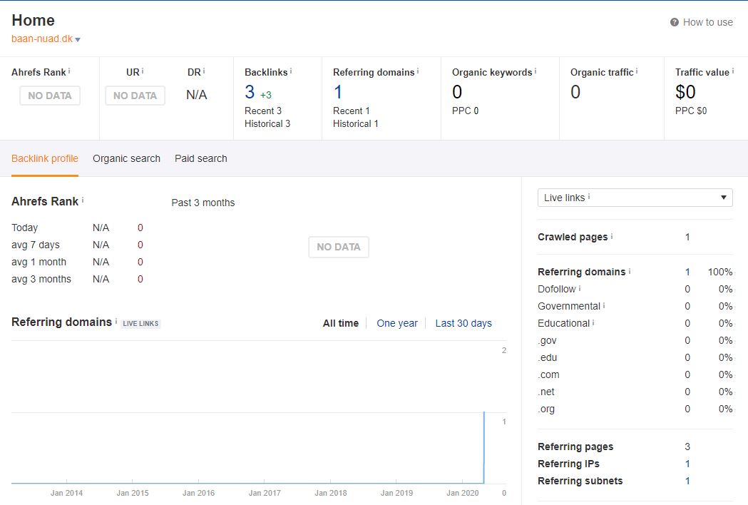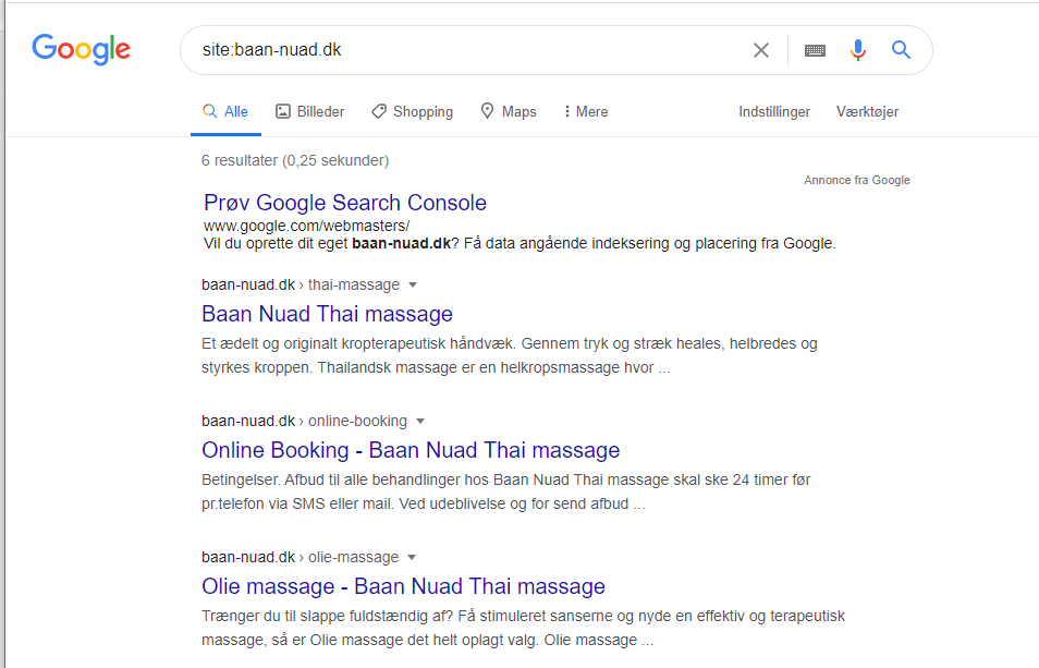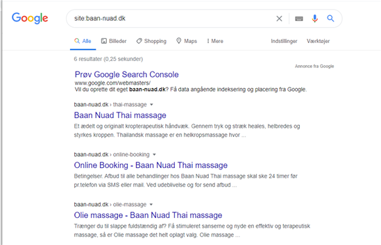 Hej Jeg kan se Google har indekseret din side, så det er "bare" et spørgsmål om at du skal have styrket dit indhold og din linkprofil Hvis du laver en søgning med "site:" foran din hjemmesideadresse, kan du se hvillke sider Google har fundet hos dig. f.eks. site:baan-nuad.dk