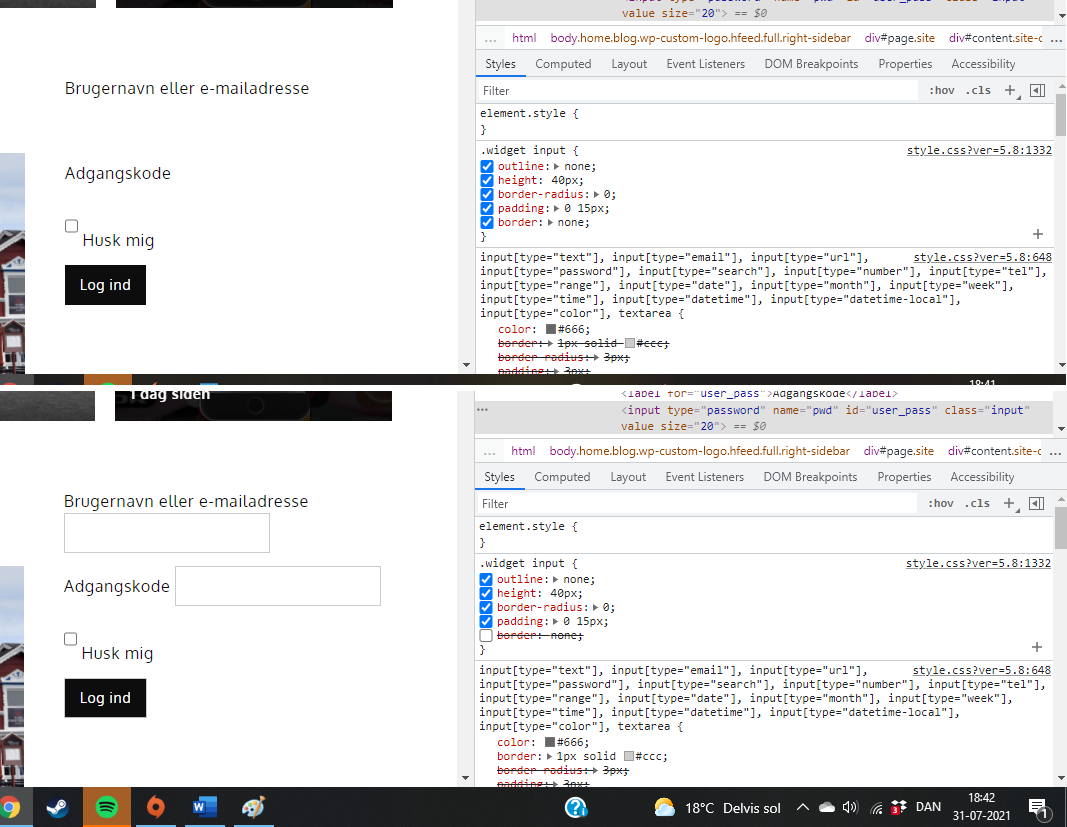 Mine tekstbokse i login sektion ser ud som på øverste billede. Jeg har prøve at ændre "border" i css, men hver gang jeg gemmer, så viser den stadig "border: None" når jeg trykker 'undersøg' i google chrome.