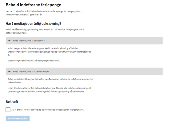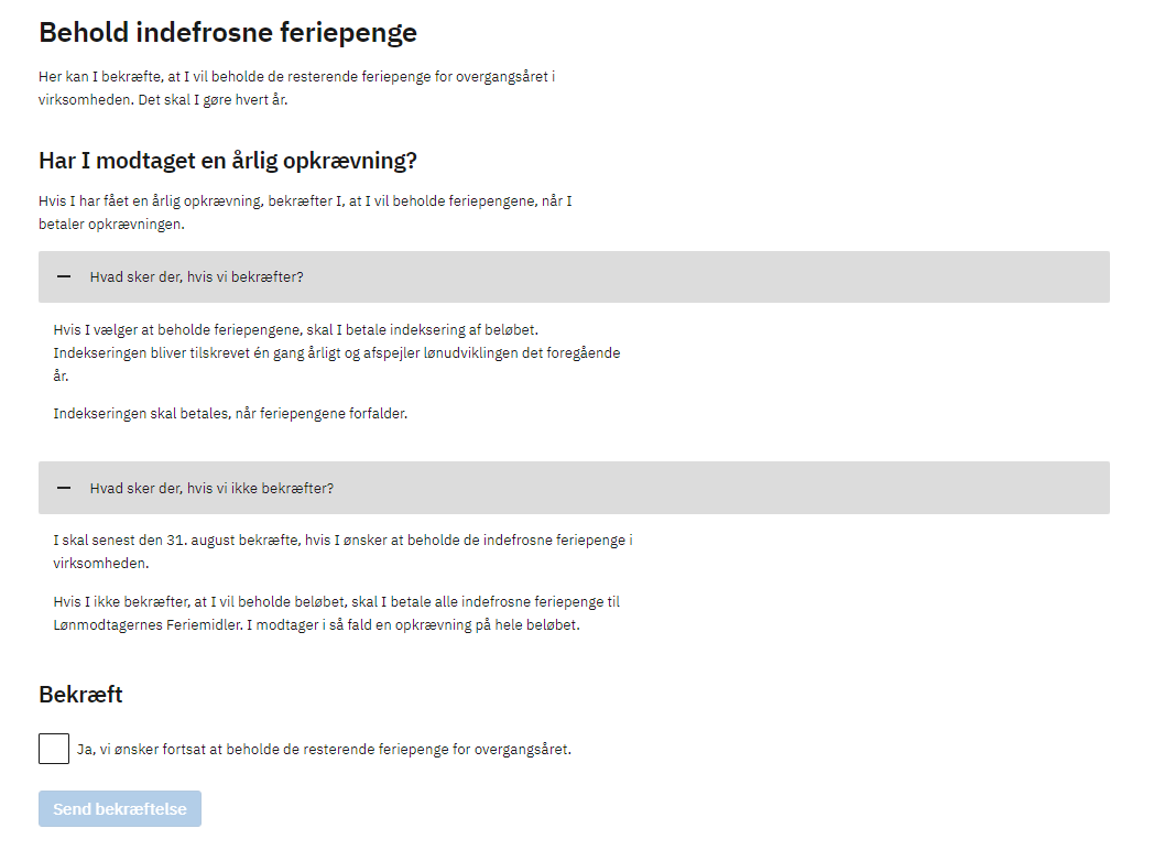 Hej alle, Vi benytter idag Intect som lønsystem og e-conomic til bogføring. Ifm. perioden med indefrosne feriepenge har vi fulgt de generelle retningslinjer fra Intect ift. hvordan dette skulle håndteres. Implikationen heraf har været, at de indefrosne feriepenge er blevet holdt i vores virksomhed. Vi havde oprindeligt tænkt, at vi gerne ville have pengene over i Lønmodtagernes Feriemidler, da vores forståelse hermed var at vi fik den simpleste løsning (bl.a. slap for indeksering mm). Dette blev oprindeligt ikke gjort automatisk som vi troede, men vi har nu fået brev fra Lønmodtagernes Feriemidler ift. hvorvidt vi ønsker at bibeholde de indefrosne feriepenge. Ifm. dette tænker vi at "ikke foretage os noget", hvilket ud fra brevet vil resultere i, at vi vil modtage en opkrævning for de indefrosne feriepenge, som så skal overføres til Lønmodtagernes Feriemidler. Dog er vi i tvivl om, hvorvidt vi skal foretage os noget ift. vores lønsystem Intect, samt hvorledes denne overførsel af de indefrosne feriepenge skal bogføres i e-conomic. Har nogen erfaringer med dette? |