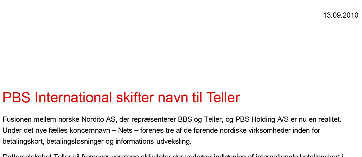 PBS og BBS fusionerer og bliver til NETS - og kortindløsningen, vist nok tidligere "Teller" i Norge, kommer til at ligge i selskabet "Teller".