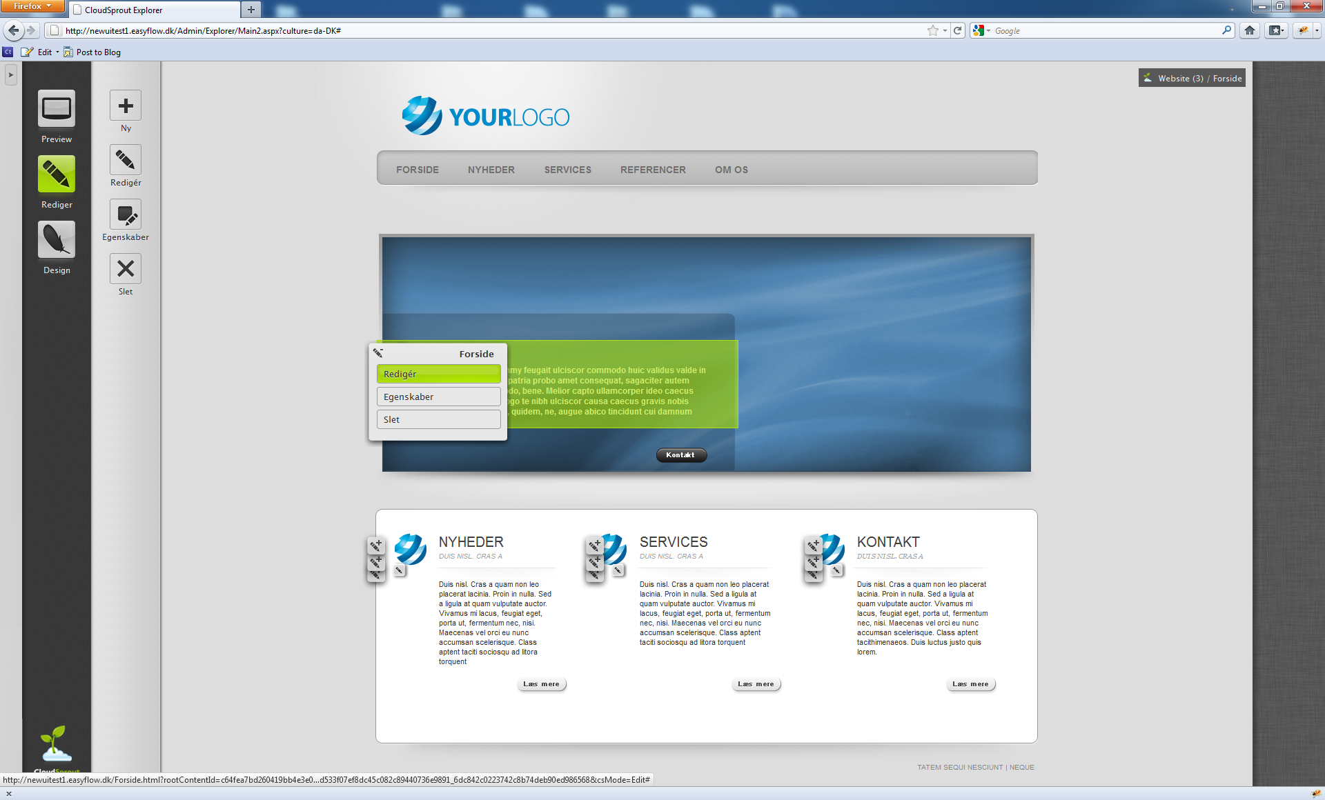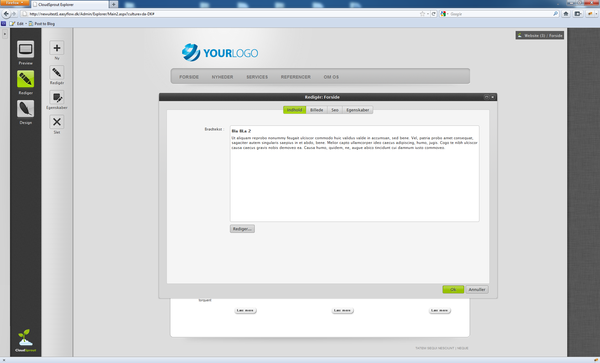 Hej Allesammen Det er efterhånden langt tid siden jeg har skrevet noget om CloudSprout her på Amino. Grunden til det er at vi har plukket, med at rette på de lektier vi lært sidst vi åbnede vores beta. Den blev hurtigt lukket igen, fordi vi opdagede at produktet simplethen ikke var godt nok til at folk selvstændigt kunne tage det i brug. Så vi måtte tilbage til tegnebordet. Dels var der en nogle processer som tog uforholdsmæssigt langtid og samtidigt var selve brugerfladen præget af hvordan som ingeniører ser verden, så den blev simplethen for kompliceret for vores målgruppe. Samtidigt var looket baseret på Windows hvilket i høj grad skræmte designerne væk. Men nu har vi designet brugerflade helt om! Grafisk er den lidt inspireret af lidt OSX, iPhone, iPad, uden at den rigtigt ligner nogle af dem. Vi synes faktisk er at den er helt sin egen. Første forskel er at man nu kan logge ind direkte fra sit website, dvs. hvis man ser en slåfejl i en artikel eller en vare, så trykker man alt-shift-l en login boks vises og man kommer direkte hen på varen. Men man kan også logge ind på normalvis: Det første man ser når man logger ind, er et oversigtsbillede (Dette vil vi dog forbedre i fremtiden) Her har målet at hurtigt få folk til at oprette et site via SproutExchange (En række gratis CloudSprout templates) eller arbejde videre på et eksisterende, sætte det live etc. Når man går til det site man vil arbejde på, kommer man automatisk ind på forsiden af sitet og brugerflade lægger sig som en trappe ude til venstre. Det lægges samtidigt en brødkrummesti i øverste højre hjørne, så for at lette navigationen. Alle links virker selvfølgeligt. Når man har fundet den side man vil rette eller designe, skiftes der til redigerings mode. Her vises små redigeringsikoner for alle steder hvor man kan rette. Når man kører musen over et ikon, vises et grønt overlay for det område der kan redigeres. Ved klik på ikonet vises en menu med muligheder. Redigering åbnes i et nyt vindue, som kan maksimeres, flyttes etc. Hvis man istedet ville havde ændret designet af siden, så havde man klikket på design ikonet og designeren var åbnet. Designeren har også fået et nyt layout men det er vi ikke så langt i implementering af. Men resultatet skulle gerne blive at den bliver meget nemmere at bruge. Træ struktureren fra den forrige version, er ikke glemt, selvom den forvirrede nye brugere gav den et uovertruffet overblik til den erfarne. Ved at klikke på pil ikonet i øverste trin af trappen foldes træstrukturen ud. Jeg vil rigtigt gerne hører din mening om vores nye brugerflade, hvad er godt og skidt. Hvordan gør vi det bedre, hvilket systemer kender du som du syntes gør det bedre?