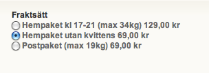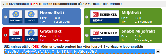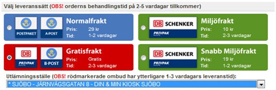 Ovenstående billede er eksempelvis fra Adlibris svenske side (i øvrigt også en ganske udmærket side), hvor der også er en oversigt over de forskellige fragtmuligheder. Som det kan ses tilbyder de per default gratis fragt, dette sker dog med b-post, hvor man så må vente et par dage mere på sin pakke, som det også fremgår af teksten forneden. Alle andre fragtmuligheder betaler du så for at vælge. Hvad miljöfrakten nærmere betegnet dækker over, ved jeg dog ikke.