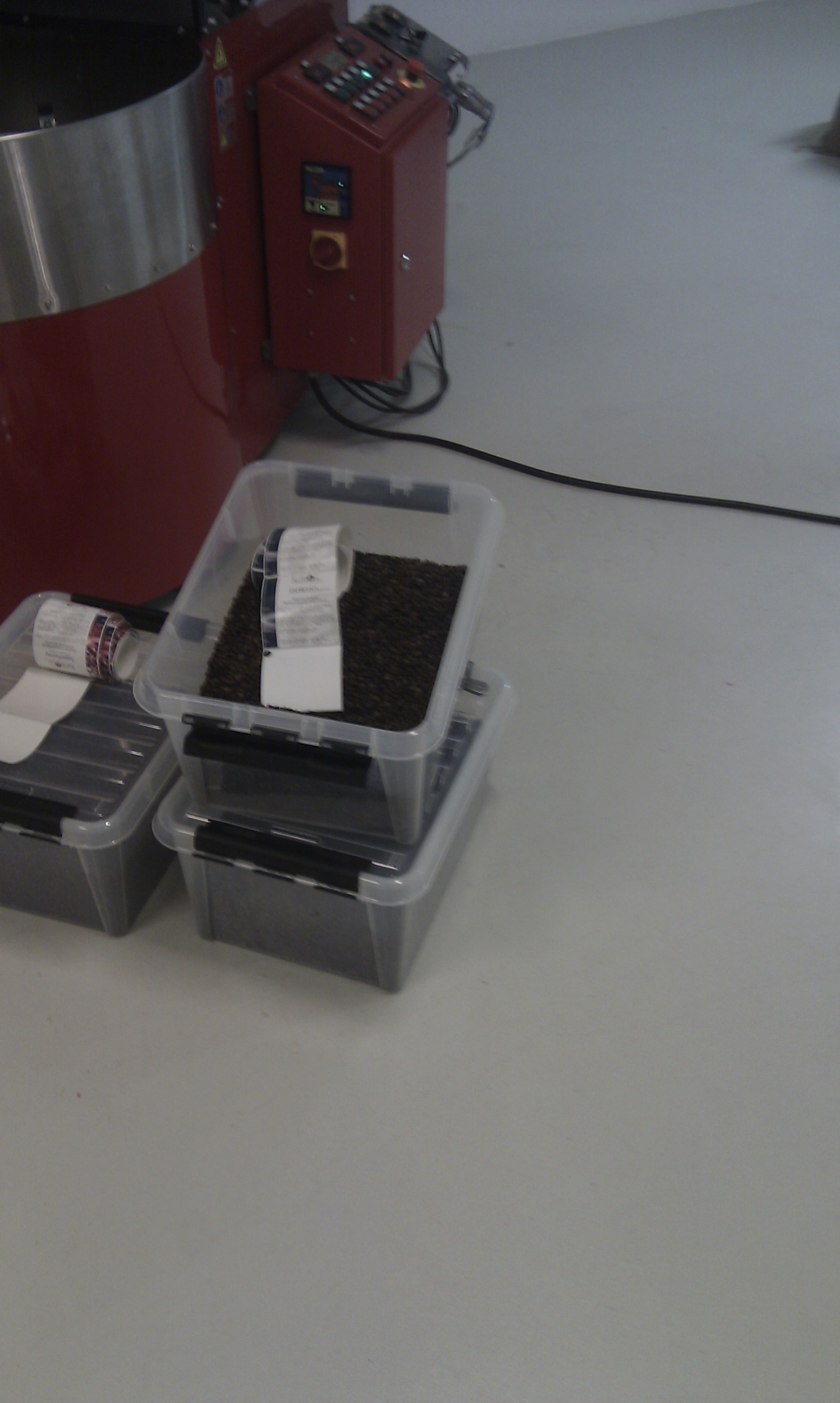 Vil lige supplere med et dug frisk billede fra risteriet her kl 2:00 om natten, hvor den sidste produktion er færdig - der er travlt så natten tager vi ofte i brug. Så nu skal den sidste kaffe bare pakkes før vi kan tage hjem...