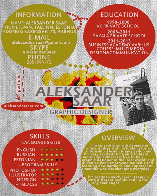I'm currently studying Multimedia Design and Communication in Business Academy Aarhus. I'm on 3rd semester of my studies, which means that I'm in need of internship for the next one. I plan on moving to Copenhagen from next year, therefore I'm searching for an internship there. I'm very much interested in Graphic Design and would love to be able have internship in that field. I don't expect anything special from my internship, just being able to work on some graphic tasks would be more than enough for me. What I can do for you - prints, banners, posters, logos, brochures, advertisments, covers, editorial designs, typography, websites basic coding, website design All the relevant information, including my skills, languages, education history, contact info etc is included in my CV: ![]() My portfolio online - www.aleksandersaar.com Contact me - aleksander.saar@gmail.com Best Regards Aleksander Saar |