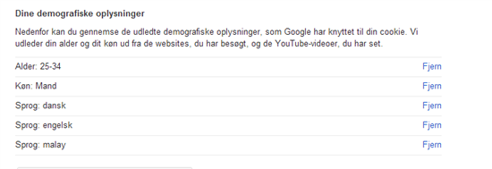 Mine interesser var rimelig rigtige - der var en enkelt, der stak udenfor, men ellers har de ramt godt mht. forskellige kategorier under IT. De har sat min alder til 25-34 - hvilket jo er lidt for højt, men helt galt er det ikke. Og sprog er sat til dansk/engelsk, så det er også meget rigtigt. |
