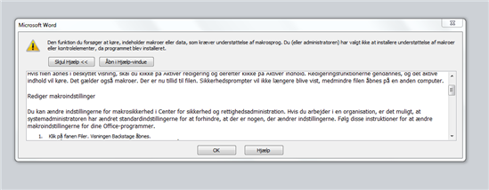 Hej, Er der nogen her der forstår sig på Word 2010 og makro fejlmeldinger? Jeg har lige indstalleret det og får den her fejl, når jeg åbner og lukker for programmet. Jeg er lost. Jeg kan simpelthen ikke huske hvad jeg gjorde sidste gang for at fjerne det. ...Jeg har lige formateret pc'en. |