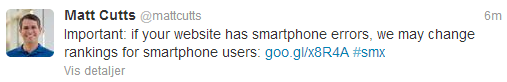 Matt Cutts har lige skrevet: Link: http://googlewebmastercentral.blogspot.dk/2013/06/changes-in-rankings-of-smartphone_11.html Forsat god dag. |
