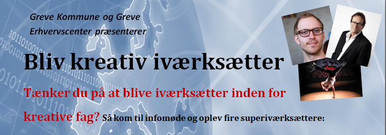 Mødet finder sted på Greve Borgerhus, Greveager 9, 2670 Greve. Tirsdag den 12. november 2013 kl. 17-21 Mødet er åbent for alle, der interesserer sig for at starte kreativ virksomhed.