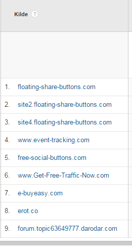 Jeg kan ikke se hvem som kommer ind på min hjemmeside, der er fra mine Facebook-annoncer eller andre steder fra, på min analytics? Det eneste jeg kan se er dette: Og det er vel spam? Men det kan da ikke passe at jeg KUN får besøg af spam sider på min hjemmeside? Hvad gør jeg forkert på min analytics? |