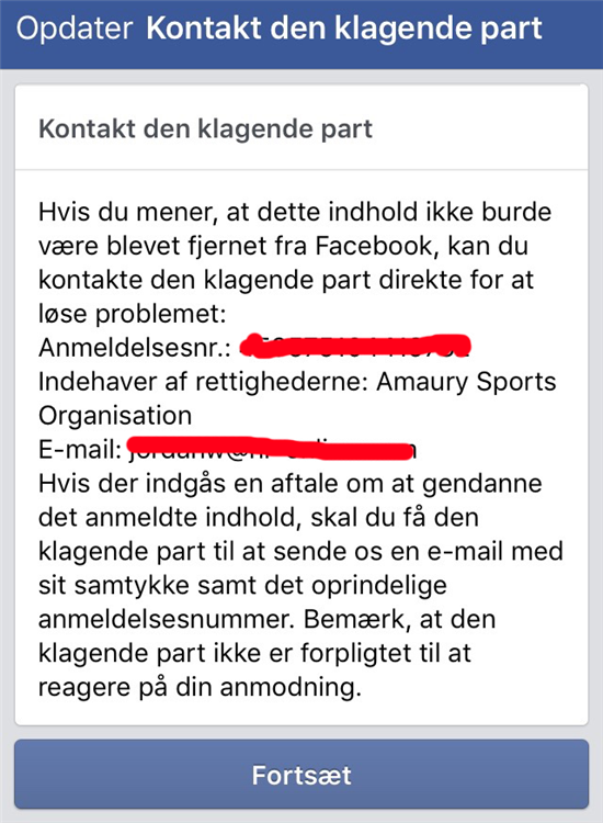 Hej herinde. En af mine facebook sider på 40.000 likes er blevet blokeret, grundet overtrædelse af ophavsret, hvilket er min egen skyld. Jeg har dog været i kontakt med organisationen, som har anmeldt og deaktiveret min side - Vi er kommet frem til en aftale, at de vil give mig min facebook side tilbage, hvis jeg ændre navnet, hvilket jeg selvfølgelig har sagt Ja til. Facebook skriver i en robot-automatiseret mail, at anmelderen/organisationen skal skrive til Facebook, hvis siden skal genaktiveres, MEN facebook skrev ingen mail, som man kan skrive til facebook på... Jeg har igennem mange års erfaring med FB, opfattet det som en nærmest umulig opgave, at tage personlig kontakt til Facebook og min søgning på google gav heller ingen resultater. Hermed mit spørgsmål: Er der nogen, som har erfaring eller/og som ved hvordan, at man kan komme i kontakt med facebook via e-mail? (se evt. beskeden fra FB på billedet). Håber virkelig der er en, som kan hjælpe! Mvh. Erik |