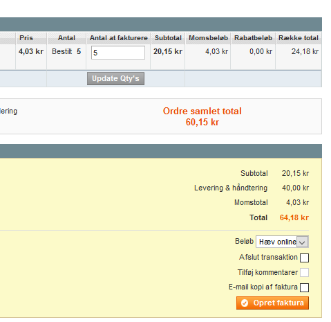 Hej alle. Jeg opdagede et problem i min magento webshop i går. Problemet er at jeg ikke kan oprette en faktura. Dette kan jeg ikke da den forsøger at hæve et højere beløb end tilladt. Der bliver af en eller anden grund tillagt en moms igen, og derved skaber et nyt totalbeløb. Der er derfor 2 totalbeløb, der ikke er ens. Jeg har vedlagt et billede, der viser beløbene og de to forskellige totale beløb. Magento prøver at hæve de 64,18kr og ikke de 60,15kr Håber nogle af jer kan forklare hvorfor det sker. Mvh Aleksander Johansen |