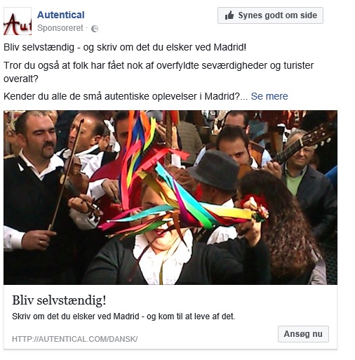 Kære iværksætter-kolleger, Jeg har over de sidste uger kørt en rekrutteringskampagne på Facebook målrettet danskere bosiddende i storbyer og andre spændende destinationer over hele Europa - men uden resultat... Jeg søger hermed hjælp og konstruktiv kritik af annoncen, siden den linker til (http://autentical.com/dansk/) og den generelle side (http://autentical.com/) med baggrundsinformation. Hvad er det der ikke holder? Er der noget der ikke virker helt troværdigt? Hermed annoncen (i dette eksempel for Madrid): På forhånd tak for hjælp og konstruktiv feedback. Hurtige og smarte bemærkninger frabedes! |
