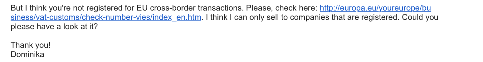 At du ikke er momsregistreret. Hun kan ikke sælge til dig uden moms og hun betragter dig ikke som et firma. Så enten må du overtale hende til at sælge til dig med hendes lokale moms eller også lade dig momsregistrere.