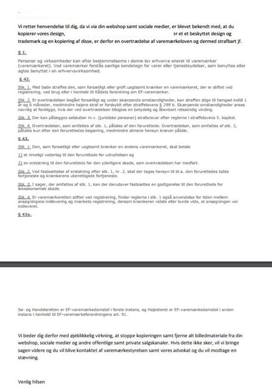 Hej Amino'er Så søger jeg lidt jurahjælp igen. På samme adresse er et enkeltmandsfirma, der producerer smykker og smykkedele. Der er fra flere kunder, via sociale medier, fremkommet ønske om nogle specielle smykker. Der er fremsendt billeder fra en anden hjemmeside. Jeg søgte på flere sider, om der var TM på disse, men der kom intet frem. Smykkerne blev produceret (af dele, som var på lager og ellers kan købes på via diverse webshops) Der blev lagt billeder på hjemmesiden (vores smykkefirma's) og der har været godt salg i disse. Nu er der modtaget anmodning om at fjerne disse, da afsender mener at have TM på disse. Dette kan stadig ikke ses på hjemmesiden. Vil også lige nævne: Vores pris er kr. xxx,xx, den som mener at have TM, er prisen kr. x.xxx,xx. Spørgsmål: Når der ikke er anført TM/patent, så kan alle jo lave det samme, eller med ændringer? Alle input er jeg modtagelig for. Og lige checket igen, ingen TM/patent anført. |