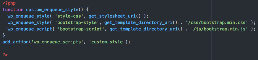 Hej Amino Jeg er ved at eksperimenter med at lave mit eget Wordpress theme, og selvfølgelig er jeg kommet til at skulle enqueue mine styles og scripts. Min kode i php ser således ud: Jeg har prøvet at sætte skriftstørrelsen på paragraphs noget højere, bare for at se om det virker i style.css. Det gør det, men bootstrap bliver ikke enqueuet korrekt, da jeg ikke kan få vist to bokse som jeg har lavet med bootstrap column grid: Nogen der ved hvad jeg gør galt? Vh Oscar |
