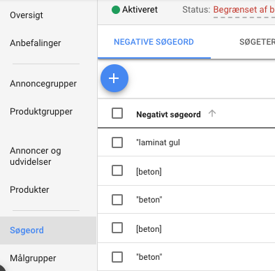 Det er i Google Ads interface under søgeord, hvor du også finder negative søgeord. Du kan se det både på dit egetbillede, og det jeg vedhæfter her.