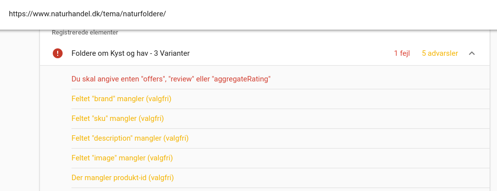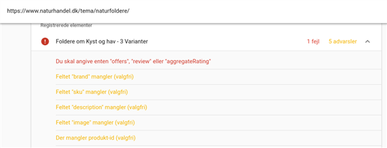 Der er fejl i det som Google kalder Structured Data på dine produkter. Nu ved jeg ikke hvordan schema bliver genereret på dit website? men der mangler nogen informationer i data.. Det kan være du kan udfylde info på produktet og det så bliver overført til schema.