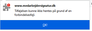 Jeg har på indtil flere nyere og ældre PC’er forsøgt at installere udvidelsen til medarbejdersignatur (fil). Jeg har fulgt https://www.nets.eu/dk-da/kundeservice/medarbejdersignatur/noeglefil/Pages/nnp-firefox.aspx indtil flere gange og med og uden aktiveret antivirus program. Derudover med Firefox kørt som administrator, i privat vindue eller normalt. Alle gange kommer jeg til punkt 3 (i ovenstående link), og i stedet for punkt 4 får jeg dette billede nogen forslag til en løsning? |