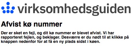 Jeg forsøgte at komme ind på virksomhedsguiden.dk to gange i går og igen her til morgen, men hver gang (efter at have ventet i evigheder) fik jeg besked om at dersværre var sket en beklagelig fejl. Eneste mulighed var at sige ja tak til at blive sat i kø igen