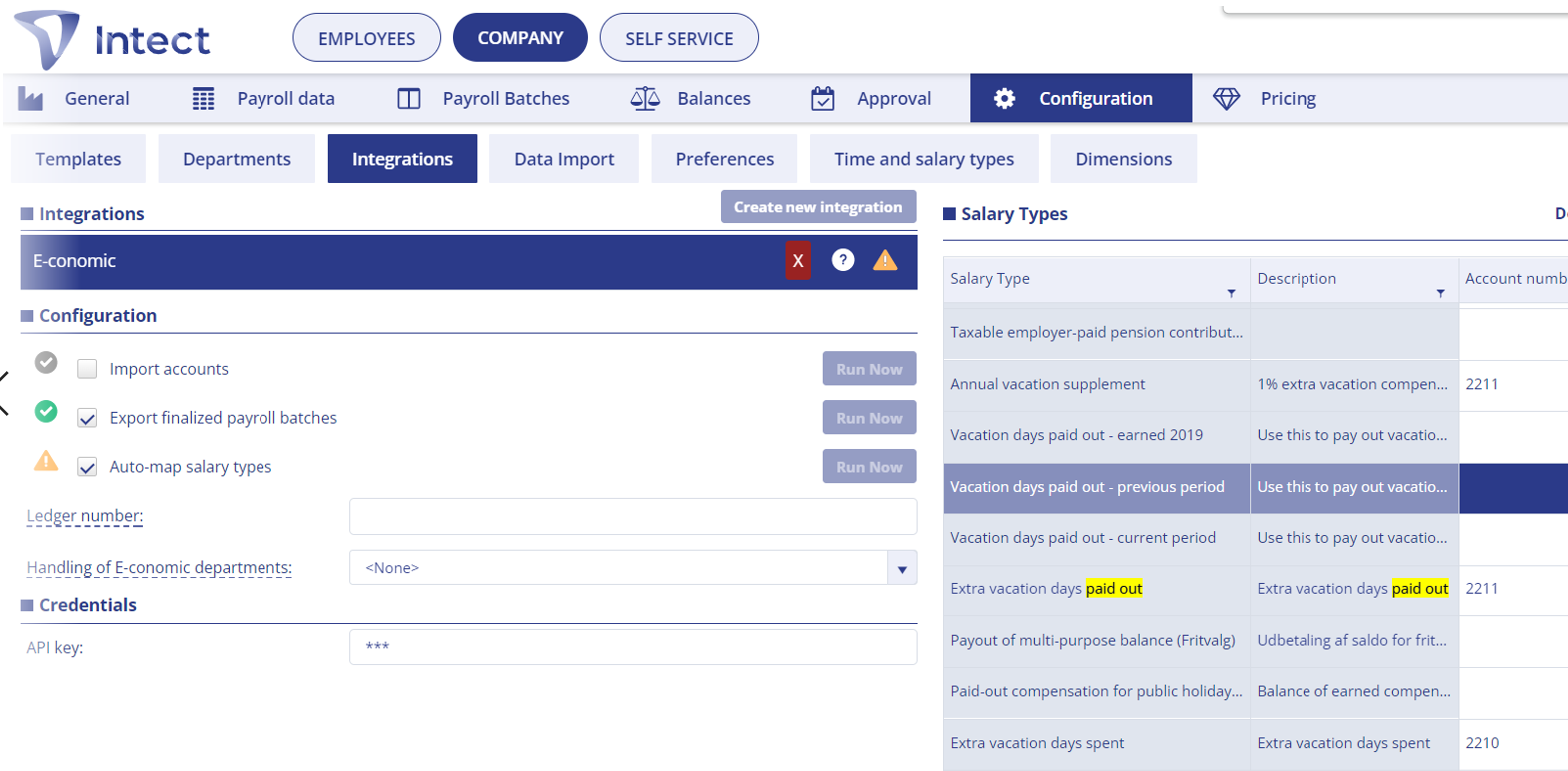 3) For at kunne foretage lønkørsel fra Intect for denne periode skal vi tage stilling til hvilken konto i e-conomic vi skal skrive ud for "Vacation days paid out - previous period" i Intect.