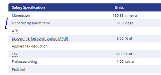 1) Vi har foretaget udbetaling af feriedage for en medarbejder via Intect konto "Vacation days paid out - previous period". Resultatet ift. lønsedlen for medarbejderen er vedhæftet: lønseddel.png
