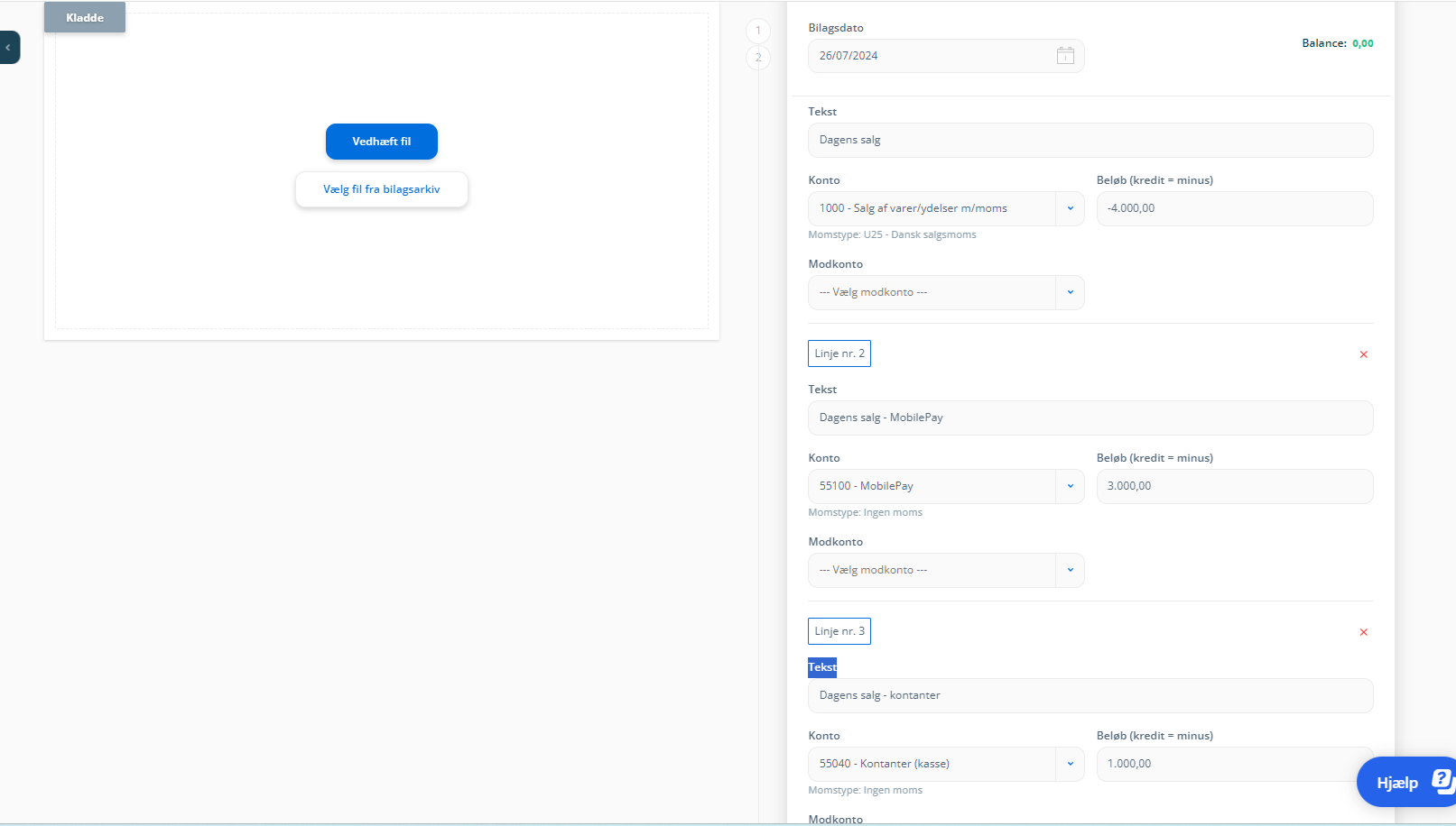 Jeg har læst Dinero's artikel om hvordan man bogfører dagens salg, og jeg er godt med. Dog bliver jeg i tvivl om, hvilket bilag, der skal uploades. Lad os sige at jeg en pågældende dag både har indbetalinger via kreditkort og MobilePay, hvilket bilag skal jeg uploade, når jeg bogfører? |