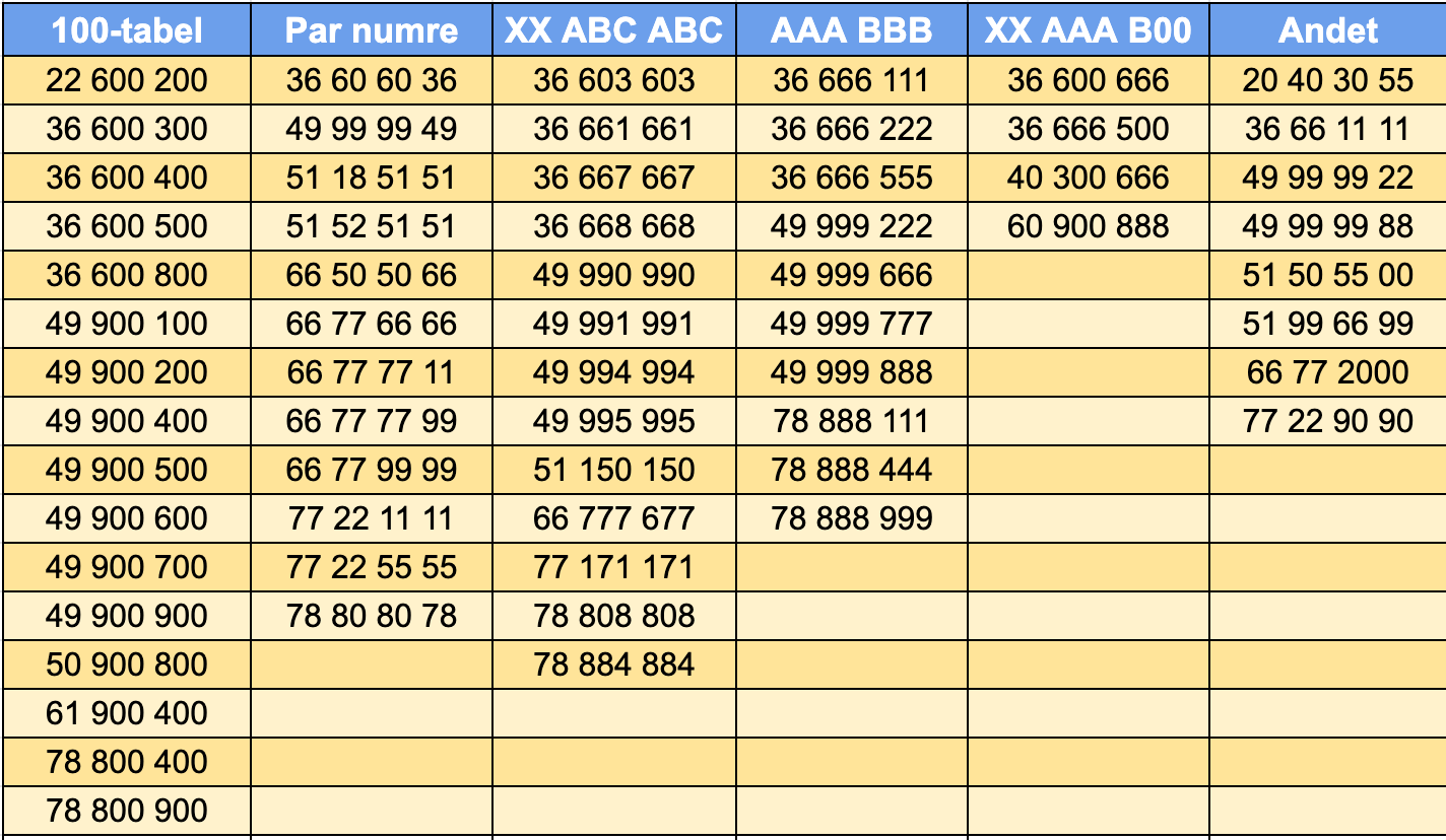 Vil du skille dig ud fra mængden og have et telefonnummer, der er lige så unikt som dig? Vi har et begrænset udvalg af guldnumre til salg, som vil give dig det ekstra touch af eksklusivitet. Perfekt til både privatpersoner og virksomheder, der vil gøre et varigt indtryk! Samt er et guldnummer ikke noget der mister værdi. Tøv ikke med at sende en besked - så finder vi frem til en god aftale. 📞 Nem at huske Sikre dig dit guldnummer i dag, før det er væk! Kig nedenfor for udvalget af numre.